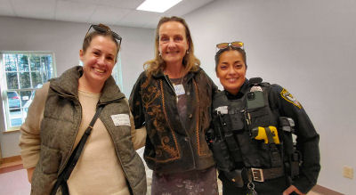 At an awards breakfast at the Samoset Resort, MMHC board vice-chair Cathy Gray (left) and board chair Kathy Muzzy (right) accept a donation of $15,000 from Jay Foster of United Midcoast Charities.