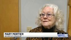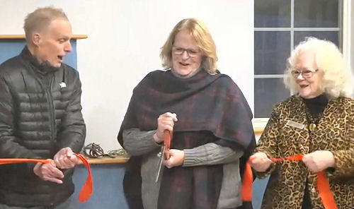 Board Member Cathy Gray cuts the ribbon, held by Belfast Mayor Eric Sanders and City Councilor Mary Mortier